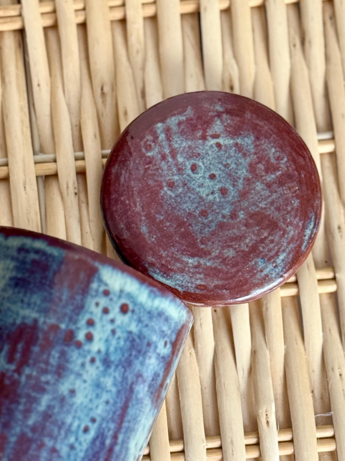 This wheel-thrown ceramic lid complements our rustic jar but can also serve as a replacement for similar-sized containers. Glazed in flowing red and blue tones, each lid has its own unique character. At approximately 8–9 cm in diameter, it fits perfectly with our matching jar or other containers of similar size.